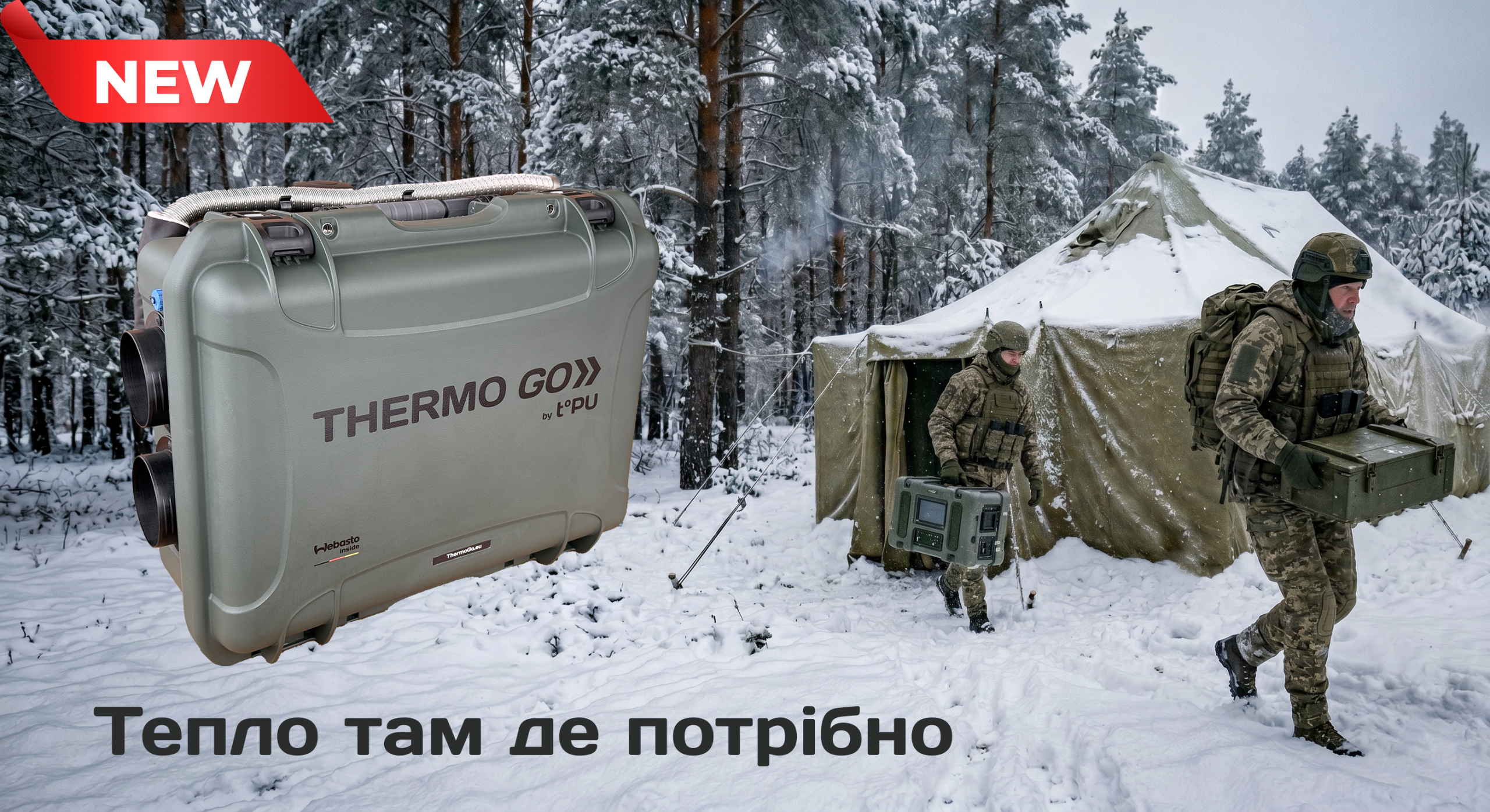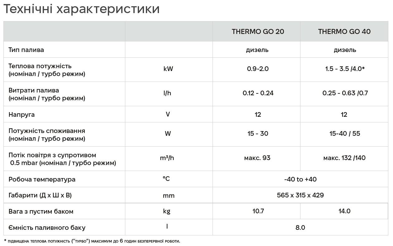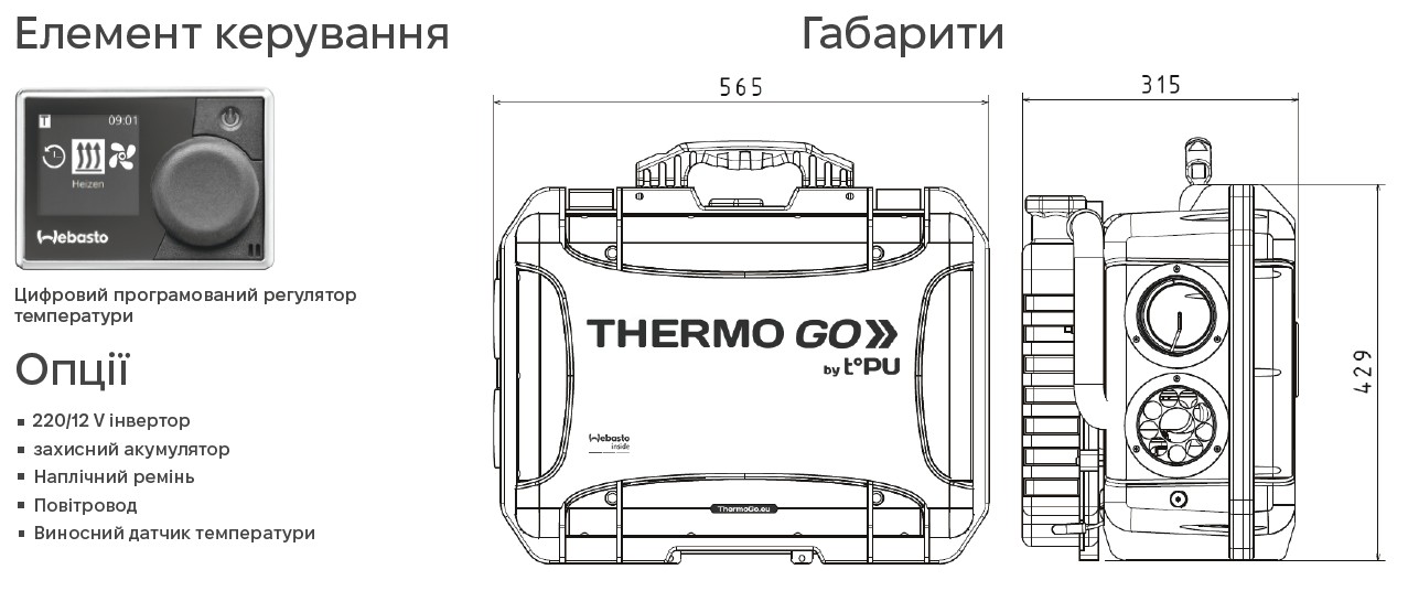 Thermo Go — це високомобільна система повітряного обігріву. Незалежно від того, де вона використовується: у наметах, укриттях чи інших спорудах, вона гарантує швидке та ефективне нагрівання. Щоб ідеально відповідати вашим індивідуальним вимогам, система доступна у версіях на 2 кВт та 4 кВт, а її роботу забезпечує високоякісний і потужний повітряний опалювач Webasto (вир-во Німеччина).